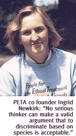 ![]() Q&A With Animal Rights Activist Ingrid Newkirk. By Maria Nasif WITH HER FIERCE opposition to animal experimentation, a carnivorous diet and even pet ownership, Ingrid Newkirk has earned her share of critics since she co-founded People for the Ethical Treatment of Animals. For more than a quarter-century, Newkirk has dedicated herself to the battle for animal rights. She'll be honored in Tucson on March 8 at the Star Awards, an annual celebration of Tucson's animal-rights community. Newkirk recently chatted about her work: TW: What involvement does PETA have with congressional lobbies or other government policy makers? IN: None. PETA encourages grassroots movement. You have to change the mind of the person at the bus stop before you can reach government. We will do auto-dials to our members, asking them to contact their representatives and congresspeople on particular bills and legislation. TW: Where do see the movement in 10 years? IN: Well, I haven't got a crystal ball, but we've made enormous strides in the previous decade, and I see that trend continuing with greater momentum. Issues of animal exploitation are currently at the forefront of discussions with decision makers in both health and industry. Ten years ago, that was not the case. I feel cosmetic and household testing on animals will soon be a thing of the past. The fur industry is already seeing a major decline in sales. TW: Will you see the end of vivisection in your lifetime? IN: That all depends on how long I live. I believe we'll see the end of animal models in medical and veterinary schools. The ethical issue is on the table now. We'll see the end of animals used in the space program, in weaponry, in drug addiction studies. Non-human primates, particularly the great apes, will be off the list of "tools for research." Breeding programs for apes are a failure, and even hard-nosed experimenters will be turning the tide. TW: How are the conditions in laboratories? IN: Conditions in laboratories have improved slightly, depending on the facility. I've inspected laboratories where conditions were horrendous. A beagle with her intestines lying on the concrete, and lab technicians microwaving animals out of boredom. Both the National Institutes of Health and the U.S. Department of Agriculture have investigators who can take action. But I don't think they can adequately cover the facilities of one state, let alone 50. TW: Do you see a connection between inter-species violence and violence among ourselves?