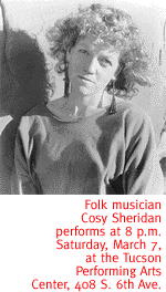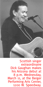 Performance is 7:30 p.m. in the UA Peter Marroney Theatre, located on campus at the south end of the pedestrian underpass on Speedway east of Park Avenue. Regular performances continue at 7:30 p.m. Tuesday through Saturday, March 24 through 28, with select weekend matinees. Tickets range from $9 to $14, and are available at the UA Fine Arts box office. Call 621-1162 for reservations and information. TOPICAL TROUBADOUR. Known for his guitar wizardry, thought-provoking lyrics and velvety voice, Dick Gaughan is considered by many to be Scotland's premier singer. A native of Glasgow, Gaughan began his career in 1973, performing his politically tinged work mainly throughout Britain, Ireland and Europe, with rare trips to the United States sandwiched in between. Now Tucson gets a chance to hear the man called "Scotland's head and conscience," and the "Pete Seeger of Scotland."