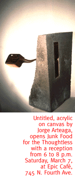 Tours are at 1 p.m. through Friday, March 13, in the WACC, 1415 N. Sixth Ave. Reservations are required; call 670-6501, ext. O. HIGHLY RECOMMENDED. In a review, Tucson Weekly art critic Margaret Regan called Trena Howard "a young and energetic painter who has boldly taken on the big issues. The sins of racism, colonialism, sexism and organized religion haunt her canvasses." Now Howard's provocative work is on display in the Great Art by Students and Professionals (G.A.S.P.) Gallery, located in Utterback Middle School. This represents the fourth show by G.A.S.P., which is the only student-run gallery in the Old Pueblo. Exhibit runs through March 24 in the G.A.S.P. Gallery, 3233 S. Pinal Vista. For information, call 617-6100.