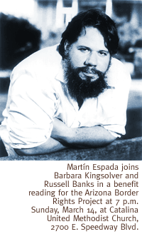 Kingsolver is a Tucson talent of global proportions, the author of poetry, essays, short stories and the award-winning novels Animal Dreams, The Bean Trees, and Pigs in Heaven. Her latest book, The Poisonwood Bible, has also garnered rave reviews. Banks is the acclaimed author of nine novels, including The Sweet Hereafter, Rule of the Bone and Continental Drift, all of which became films. The screen adaptation of his 1989 novel Affliction is currently showing in theaters across the country. Called "the Latino poet of his generation," Espada received the American Book Award for his collection of poetry, Imagine the Angels of Bread. Much of his writing arises from his Puerto Rican heritage, and vocations ranging from bouncer to tenant lawyer. Proceeds will help The Arizona Border Rights Project fight against discrimination, law-enforcement harassment and abuse of authority along the U.S.-Mexico border. The reading is 7 p.m. in the Catalina United Methodist Church, 2700 E. Speedway. A press conference will precede the reading at 6:15 p.m. Tickets are $12, $8 for students, available at Antigone Books and at the door. Call 770-1373 for details. DARK BARD. Shakespeare's dark tragic-comedy of law, redemption and hypocrisy is revisited in Arizona Repertory Theatre's production of Measure for Measure. Against the indulgent and decadent background of Vienna, the Duke Vincentio turns over the reigns of government to Angelo, secretly watching to see if "power changes purpose." Predictably, Angelo attempts to wield an iron hand, enforcing a strict moral code even as he's corrupted by his lust for a novice nun. This timely examination of lines between the public and private has been called one of Shakespeare's finest achievements. Today's performance is at 1:30 p.m. in the UA Laboratory Theatre, on the south end of the pedestrian underpass at Speedway and Park Avenue. Additional performances this week are at 7:30 p.m. Thursday and Friday, March 11 and 12; 1:30 and 7:30 p.m. Saturday, March 13; and 1:30 p.m. Sunday, March 14. Performances continue Tuesday through Sunday, March 23 through 28. Tickets range from $10 to $16, and are available at the UA Fine Arts box office. Call 621-1162 for reservations and information. CREATIVE STROLL. Take a creative trek at the ninth annual Tubac Art Walk. Our neighboring burg will host numerous artists along its charming, historic streets, set against the backdrop of the Santa Rita Mountains. "It's the one special time of year that the Tubac galleries invite their featured artists from around the nation in joining the resident artists who work and live in Tubac," says Robert Musmanno of the Tubac Chamber of Commerce. "The variety of art is endless." The Art Walk continues from 10 a.m. to 5 p.m. Saturday and Sunday in Tubac, 45 minutes south of Tucson on I-19. Call 398-2704 for details.