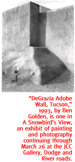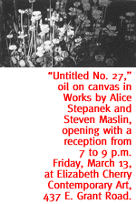 Performance is 8 p.m. in UA Crowder Hall, located in the Music Building at the south end of the pedestrian underpass on Speedway, east of Park Avenue. Tickets are $12 and $14, available at Hear's Music, Antigone Books, or by calling 327-4809. CREATIVE DUO. Alice Stepanek hails from Germany, Steven Maslin from London. Together, they've spent more than a decade creating highly detailed landscape paintings, and now their work comes to Tucson with a new exhibit at Elizabeth Cherry Contemporary Art. Combining formal and conceptual practice, these works are aesthetically pleasing while also stretching the theoretical boundaries of contemporary art. "In their generous accessibility, the paintings of Stepanek and Maslin represent elegant images of fragmented exterior views," says European critic José Lebrero Stals. "They are common places, encountered as an indicator of and testimony to central European urbanity, meticulously reconstructed through painstaking execution and highly finished detail." Exhibit runs through May 2, with an opening reception from 7 to 9 tonight, in Elizabeth Cherry Contemporary Art, 437 E. Grant Road. Regular gallery hours are noon to 4 p.m. Thursday through Saturday. For details, call 903-0577.