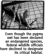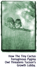 ![]() WHEN THE MONDAY edition of the Federal Register landed on government desks this week, the cactus ferruginous pygmy owl was listed as a new endangered species. That designation may change the future of development in the Tucson basin. Measuring a mere 6-1/2 inches from beak to tail, the pygmy owl is the second smallest owl, next to the elf owl, in North America. But now, with an endangered species listing, it could exert a huge impact on its surroundings, which include most of the drainage systems around Tucson. Members of the Southwest Center for Biological Diversity herald the listing as one of the last, best hopes for protecting desert riparian areas. Tucson's Growth Lobby and its supporters see the listing as a monkey wrench in the cogs of economic development and a misuse of the Endangered Species Act. Caught in the middle, the U.S. Fish and Wildlife Service, the federal agency that determines which species are endangered, floats in a bureaucratic purgatory. Both sides accuse the agency of working for the opposition. The agency seems neither to embrace the idea of commencing an all-out effort to save the owl, nor does it entirely derail that possibility. It was the FWS that first outlined 290 miles of potentially critical habitat for the owl. On the other hand, the agency has been dragging its feet all the way in making the endangered determination. The FWS would be in dereliction of its duty without the encouragement of several lawsuits, says Southwest Center biologist Peter Galvin. The Southwest Center launched a lawsuit in 1992 in order to get the FWS to speed up its listing of the pygmy owl, (Glaucidium brasilianum cactorum) and four other species, says Galvin. Four of those species are now listed: the Huachuca water umbel, the Canelo Hills lady's tresses (both plants), the Sonoran tiger salamander and, of course, the cactus ferruginous pygmy owl. The jaguar, recently spotted again in Arizona, has yet to be listed. The lawsuit continues in Federal District Court in Phoenix, with Judge Roger Strand presiding. The Southwest Center folks want to see the jaguar listed and critical habitat designated for the salamander and owl. The designation of critical habitat lays at the heart of this battle. If the pygmy owl lived in some far-removed creosote flat, it's unlikely any would raise opposition to its listing. Unfortunately for the owl, its preferred habitat is well-established desert riparian areas, like the cottonwood forests that once lined the Santa Cruz River. It also lives in xeric riparian areas, meaning desert washes and canyons with intermittent water, like Honeybee Canyon.