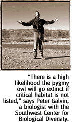 Galvin says Parker and Burton are part of a whole army of "biostitutes" hired by the Growth Lobby and minions appointed by the anti-environmental state government. Galvin says he hopes once the public sees the result of protecting the owl, forested river banks, running streams and abundant wildlife, they'll agree the Endangered Species Act is doing its job. "The Act was passed for a reason, and if it causes some people a little discomfort in their profit plans, that's the way it goes. Biologically, (the FWS) agreed with us every step of the way, but they had to be dragged kicking and screaming. It's possible it's too late for the pygmy owl, I have to admit, but I don't see that as a reason to give up." Galvin predicts the FWS will bow to virtually any development pressure and will sell out the owl. "The Fish and Wildlife Service," says Galvin, "is notoriously weak-kneed." The Southwest Center plans to begin a "pygmy watch" to maintain a vigil over the owl's habitat. If the FWS fails to step in and protect the owl, Galvin says, Southwest Center lawyers stand ready to hurl lawsuits at them.