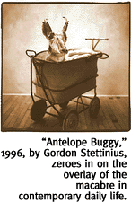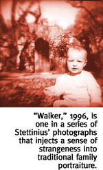 ![]() Check Out The Interesting Shows At Downtown's Bero And Raw Galleries. By Margaret Regan FOR THE THIRD time in three years, Gordon Stettinius has put work from his "photographic diary" on display at Bero Gallery in downtown Tucson. A former Tucsonan who's now based in Minneapolis, Stettinius shows a new suite of 26 photographs, mostly soft-edged, sepia-toned works bathed in shadows and light. The pictures veer from magical, even weird, staged images--like the stuffed antelope head in a baby stroller in "Antelope Buggy"--to luminous family portraits that are many steps above the standard snapshot. What's interesting is that the family life pictures inform the mystifying ones, and vice versa. For instance, "Dinosaurs" is a creepy collection of monsters, shot to loom largely and ominously in the foreground of the picture. But these threatening giants are children's toys, plastic castoffs from the family nursery. Similarly, a "Plywood Angel," perhaps lifted from the family's or a neighbor's cache of Christmas ornaments, is photographed floating eerily in a murky sky. In both cases, with a Rod Serling sensibility, Stettinius has zeroed in on the overlay of the macabre in contemporary daily life. Then, taking the other tack, Stettinius injects his family portraits with a sense of the strange. In "Walker, New Orleans," a swaddled baby, very much alive, lies among tombstones, a bouquet of flowers resting on his blankets. Again, in "Walker in Cemetery," Stettinius poses his young son in a graveyard, this time sitting him upright in front of a row of dilapidated grave markers. The healthy baby effectively becomes a symbolic counterpoint of life to the death around him, but by no stretch of the imagination is this your usual baby photo. Even Walker looks a little puzzled. If there's a theme at all to this loosely organized chronicle of the photographer's days, it would the be gestation, birth and first year of this child, whose mother is Robyn McDaniels, a former Tucson photographer who used to go by the name Stoutenburg. (McDaniels, still working as a photographer in Minneapolis, was originally scheduled to show her work at Bero with Stettinius, but plans fell through.) Some of Stettinius' images of their child are simply lovely. "Walker in Wirth Park" is a reprise of the famous Gene Smith picture of his two children walking off through the forest into the light. In a twist, Stettinius pictures his son toddling through a sunny meadow toward the dark forest. "Walker on Sun Temple Mound, Natchez, Miss." again drenches the child in light. This time, he's a tiny figure asleep in the grass under the sheltering branches of a grove of trees.