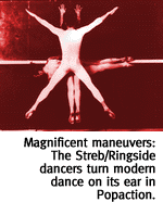 Her all-out rebellion against dance convention notwithstanding, Streb came to modern dance via the usual route. She majored in dance at the State University of New York in Brockport. After graduation in the early '70s, she headed first to San Francisco, then New York City. She had no money, of course, but in the Big Apple she was careful first to sign up for the dance classes she wanted (one modern, one ballet, every day) before she signed on for the standard restaurant jobs. Her two lives took a parallel upward course: While she was working her way up from dishwasher to chef, she was making her way from neophyte dancer to presenter of her own choreography at small concerts in assorted rented lofts. The circus-rodeo dance aesthetic evolved gradually. "It was such a slow process. Really, close to 20 years. When I first started showing work in New York...what I wanted to see happening in dance wasn't happening...I had a lot of trouble making sense of classic movement." First she started experimenting with changing the angle of the floor. Next came a vertical pole, then a "hill dance" performed on a platform at a 40-degree angle. From there it was a short conceptual leap not only to the upright floor she uses in "Wall/Line" ("I re-invented the floor! I scooped it up and put it vertical,") but to a commitment to make only dances that were about "getting bodies to a new place in space." In 1985, Streb formed her own company, which has since performed all around the U.S. and in Europe. Most of the performers are trained dancers, but not all. One, she says, is a "totally phenomenal" ex-basketball player from D.C. Several have gymnastics training. But Streb is less concerned with her dancers' histories than with their desire to defy the laws of physics. "Even more important is the mind and spirit and heart behind this. You have to want to do this and not something else."