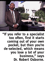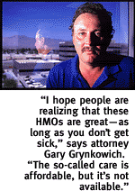Physicians are also frustrated at the poor quality of care they're giving under HMO restraints, according to Osborne and six other physicians who requested anonymity. "If you refer to a specialist too often, first it starts coming out of your own pocket, but then you're de-selected, which means you lose a lot of your business," explains Osborne. "But nobody can say anything because they'll be de-selected!" Osborne believes that when HMOs started clamping down on referrals to specialists, the profits soared. "Greed is acceptable in America, but can it be mixed with healthcare? No, and therein lies the dilemma."