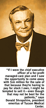 "In healthcare today," Shropshire says, "you have directors who have a prime allegiance to the stockholder. We don't have a satisfactory answer to this yet." Verne Singleton, former CEO of University Medical Center, says "managed care is a good idea that's going bad. Should our healthcare be managed based on the value of our stock? It's become a commodity because the world revolves around economics, like it or not." There are plenty who don't like it. Physicians are much more vocal, and some--like those at Tucson's Thomas-Davis Clinic--are in the process of unionizing. According to Dr. Robert Osborne, who's spearheading the efforts to unionize the Thomas-Davis physicians: "The HMOs offer a physician group an exclusive contract to take care of a large volume of patients. What happens is that another physician group, alarmed at losing patients, scrambles together and offers to do it for less. When it comes time to renew the contract, the HMO claims their costs have been too high--the physicians will have to take a 10 percent reduction or lose their patients to another group. But it takes some expense to be able to give quality care." There are so many groups of physicians competing for the same base of patients that, for the first time in U.S. history, physicians see medical unemployment as a looming threat. "I don't think the public is at all aware of what's really going on and the extent of this," says Osborne. "Physicians used to simply pull their patients out of those conditions and admit them elsewhere, but now we have no say in this because HMOs tell us where to admit patients. If we complain, we'll be de-selected by the HMO. We can't demand the hospital change, because it's busy trying to survive." Osborne believes the only way to give physicians a say in how their patients are cared for is to unionize.