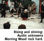 Once you accept that, SXSW can be a lot of fun. Pay no attention to the swirling masses orbiting around you, trying to get a surreptitious glance at the ridiculous laminated badge hanging around your neck; or the angry wristbanders jockeying for position outside the overcrowded clubs. There are, after all, worse situations to be in than wandering around a trade show floor with faceless people thrusting free CDs at you. Once you hit sensory overload, the din of buying, selling and networking becomes a pulsating, insectine hum in the background. It's almost pleasant. Call it "ambient," since that seems to be a word on everyone's lips these days. SXSW truly does seem to offer something for everyone, though perhaps not as much for relative unknowns as previously imagined. We saw a lot of live music, mostly by bands you've already heard of, which seems unfortunate. Maybe it's all just a big misunderstanding, but wasn't the idea behind South By Southwest to create a great big showcase of budding regional talent, to unite industry pros with tomorrow's talent? It's more of a Who's Who than a Who's that?, with alternarock darlings like Soul Coughing, Cake, and the Smoking Popes making their grand appearances following big-label debuts. Even quintessential underground acts like Yo La Tengo seemed to suffer by association, with a set so over-the-top and self-indulgent we had to leave after the first two songs (which lasted for more than 20 minutes, anyway). A parking garage was packed to the gills waiting for the Flaming Lips' audio experiment, in which they intended to create some new piece of music by simultaneously blasting recorded music from the tapedecks of a fleet of parked cars. A fuse blew, rendering a key stereo useless, leaving one of the flapping Lips to try to explain over a bullhorn to a thousand people what it was they were supposed to have heard. Cool, huh? Just to orient you, this happened after Matthew Sweet and before the Supersuckers, the two big, official draws this year. Without diminishing the incredible feat of organizing such an event, it's sort of like a few years back when U2 won a Grammy for alternative album of the year, or whatever. It seems embarrassingly inappropriate. The band roster at SXSW has become formulaic: the tried-and-true past performer, the new-and-hip commercial success, and the necessary quota of relative unknowns with either incredible good fortune or a well-connected manager. Everyone seems to agree the festival has gotten too big. The organizers tried to downscale this year, ensuring a smaller percentage of folks, all of them Austin residents, would shell out $65 for a wristband only to stand outside a club all night waiting to see their favorite bands. Hey, they were warned to arrive early and not move until that one band took the stage at midnight. In light of the fact the fest probably isn't going to change much, the really cool thing about SXSW now is the anti-SXSW movement. This consists of a loose network of rejected or renegade bands who set up in parking lots and non-venues all over the city to play free shows. Their antics are advertised by playbill and word-of-mouth only. One such show, among the most inspiring showcases we saw all weekend, was an Austin-based chick band called Morning Wood.