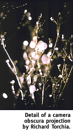 ![]() The Ancient Camera Obscura Is Put To Good Use At The Center For Creative Photography. By Margaret Regan THE LAST TIME a solar eclipse darkened Tucson's summer skies, a local house builder noticed a curious phenomenon. The diminished sunlight still made its way through cracks in the unsealed roof of the house he was working on, but it cast something other than the usual sunbeams all over the rough floors. Instead, everywhere the eye could see, were tiny glimmering half-moon crescents. Half dark, half light, the slivers were projections of the moon making its way across the face of the sun. The enchanted house builder was not the first person to notice this pinhole effect. He stands in very good company. Aristotle observed the same thing during a solar eclipse in the fourth century B.C. Aristotle was watching the partially covered sun flicker through a plane tree, and, like the builder, he noted the eclipse cast its own crescent image on the earth. You can puzzle over this optical problem yourself at The Waving of Foliage and the Coming and Going of Ships: Live Projections by Richard Torchia, the wonderful new camera obscura show in the darkened galleries at the Center for Creative Photography. Philadelphia artist Torchia has, among other delights, re-created the eclipse trick in an installation work called "Aristotle's Problem." Torchia has contrived an artificial solar eclipse in which a halogen light and a moving disk simulate a new eclipse every six minutes. The light shines through a pinhole and travels through a leafy branch like Aristotle's, and tumbles to the floor to create crescents that slowly form and dissolve, again and again. The work is an homage to the Aristotelian event that some scholars mark as the beginning of photographic history, coming though it did thousands of years before the first official printed photographic image in 1839. In a sense, Torchia's intriguing show spans the era from pre-photography--when cameras obscura were a tool for artists and astronomers alike, and the makings of parlor tricks and carnival sideshows--to what some, in a newly digital age, are already calling the era of post-photography. Nowhere in this exhibit, the seventh in the Center's Encounter series on cutting-edge photography, do you find a single printed photograph. Torchia instead has transformed the pitch-black galleries into a series of giant cameras obscura, which project only ephemeral images--desert plants, swirling dust, water dripping, a clock moving--on the walls, the ceiling, the floor, a hanging screen. Some move, some stay still, depending on what the original object is doing. When a drop of water drips in Torchia's real-life setup called "Klepsydra," in the reflected picture, it shoots up toward the ceiling.