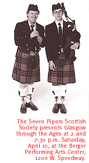 The Pipers have been on the Southwest scene since 1958, when they called themselves the Tucson Highlanders. Today, the society includes a competitive bagpipe band, and Highland and Scottish country dance programs. Its members also compete in the Western Highland Games each year, and usually take top honors. Glasgow Through the Ages will be performed at 2 and 7:30 p.m. in the Berger Performing Arts Center, 1200 W. Speedway. Tickets range from $8 to $12, and are available at Scot Photo or by calling 299-0701.