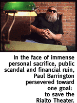 The grant is the largest chunk of the money needed to purchase the theater outright. But in order to initiate agreement on the $212,500 for acquisition, Barrington and his Rialto Foundation must show verification of matching funds. While the down payment and capital investments can account for a large portion of the match, the Foundation needs to raise an additional $60,500 in donations to make up the difference. The sum total the Foundation needs to raise to close on the theater is $75,000. Regardless of whether you believe in Barrington, you must ask yourself whether you believe in his vision to create something of lasting significance and beauty in the heart of Tucson's downtown Arts District. For once the theater is secured, it is forever protected from demolition or significant changes to its historic character. Amidst all the rumor and innuendo, there's one indisputable truth: The Rialto would be nothing without Paul "Bear" Barrington. It would be lost in obscurity, perhaps still being used as unofficial storage space by its neighboring furniture gallery. It would neither be the subject of uninformed scandal, nor slated to become a national historic landmark in our city. This is the legacy that has followed the inscrutable man since his early days as a founder of KXCI radio, and the benefactor of those legendary El Casino Ballroom shows in South Tucson. He has a history of doing things unconventionally. He also has a history of getting them done. He has set the ball in motion. He has installed fixed seating, patched walls, repaired the stage, determined the necessary improvements to bring the theater up to code. He has painstakingly stripped the cheap latex paint away from an elaborately painted mural recalling grander days. He has taken a condemned building and turned it "into a working building that's kind of ugly," he laughs. But nobody sees the beauty of that theater like Barrington. This is his gift. This is the story. The only question remaining is, do we accept it? "Nationally, they're putting us on the map with their activity. What I liked about the Rialto was that it was in between a special event and a regular Saturday night event, it was easy and special at the same time. I really appreciate the extra effort it takes to pull that off. To do it with the level of integrity that they did, working with the limitations they had...It's not easy to do what they're doing. Faced with working with people who didn't care whether they succeeded or not, they kept going at it. That's admirable." --Camille Bonzani, neighbor/owner of Café Magritte "Professionally speaking, there's a lot of work to be done, and the grant is desperately needed for them to accomplish that work. As code official for the City, we're working with them and will allow them to restore the building to the code that was in existence at the time (circa 1924). I think it's achievable. "Personally, I admire what they're trying to do. That facility fully restored would be a wonderful addition to downtown, and a tremendous effort toward keeping the heritage of our community. I'd love to see it happen." --Chief James Gresham, Tucson Fire Department "I don't subscribe to saving something just for the sake of saving it; but if the building could be utilized as a theater, and something that would add activity to that part of town, that would be a wonderful thing. Surely it's a worthy endeavor." --Jim Gresham, downtown architect, historic restoration specialist "There have been acquisitions like this, to buy buildings and keep them in perpetuity for arts uses. What's exciting about this is to see that effort continuing (on an individual level). It shows me the grassroots movement that wants--and has wanted--to make the arts the vehicle to revitalize downtown is alive and well. I look forward to seeing what's possible, and certainly in assisting in any way we possibly can. --Mary Glenn, Development Manager, Tucson Arts District Partnership "I used to go to movies there, before the war, in the 1940s. Anyone out there who has the wherewithal to make that come back, to do something for the 1990s and the next century, is doing something very positive for the downtown area. You don't revitalize by just walking in downtown and doing 40 buildings. You do it building by building. I applaud their efforts, and I'm with them all the way." --Mayor George Miller "What Paul was doing in there, the special events before I guess the Fire Department shut him down in the theater--it was a good use for the building. It was good for the building, and good for downtown." --Rich Rogers, Rialto property manager and downtown developer "Surprisingly, considering the damage (from the boiler explosion), the structure seems to be in good shape. (Paul and Jeb) have enlisted a few good consultants--architectural, structural and fire protection. I've talked to every one of them, and they say the project is feasible. We have to look at things objectively. Sometimes it's rough saying we're just interested in the nuts and bolts; but if they turn in the plans, and they do a good job, we'll certainly approve it. As far as a personal observation, it's a great old theater. It would be a great project. --Dave Mann, Building Codes Administrator, City of Tucson "I think this is one of those projects that certainly got its share of bad press. But the intent (Paul and Jeb) have had to save this building, regardless of what has gone on business-wise there, has been wonderful. They have done what nobody seemed to be wanting to do--not the owner, the city, or any private preservationists. There's something about the vibes in that place, it just has a good feeling to it. I would love to see the building in adaptive reuse, both personally and as an elected official. It would be great for downtown and wonderful for the community." --Molly McKasson, City Councilwoman, Ward VI