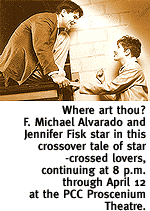 The actors, a mix of local professionals and Pima students, overall turn in fine performances. Apart from Fisk's standout Juliet, Cynthia Meier is splendid as the Nurse, a bawdy character by turns loving and morally vacillating, and J.D. Smith is persuasive as Friar Laurence. Patrick Burke is a memorable Mercutio, the witty Montague friend whose murder starts the love story on the road to its inevitable tragic end. Allison Rénee Bauman delivers a particularly vicious Tybalt. Shakespeare's text has been trimmed in the interests of brevity (the play runs about two hours counting intermission), and key characters such as Montague and his wife have been eliminated without too much harm done. Romeo and Juliet is full of exceptionally beautiful poetry, and luckily its lyric flights have not been unduly damaged by the necessary changes of "he's" to "she's," and so on. The final scene, wherein the bodies of the dead young lovers are discovered by their distraught families, is appropriately stark and moving. But it's a pity the prince's speech castigating the parents has been removed, because it embodies the moral crux of the story: The hatred between the two families has directly caused the deaths of their beloved only children. In Shakespeare's wrenching text, the stern prince rails against the two heartbroken fathers: "Where be these enemies? Capulet! Montague! See, what a scourge is laid upon your hate, That heaven finds means to kill your joys with love! All are punish'd."