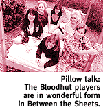 Also inspired is Lowry's "Sprechen Sex Mit Franca," a spoof of a radio sex show, complete with Germanic advice giver. The gags also have their serious side: the best of them zero in on the merchandising of sex in our cacophonous commercial world. Bloodhut, founded in 1992, is a company like no other in Tucson. The performers are the writers, and vice versa, and their subject matter is the stuff of their own lives. Taking its name from the blood hut of earlier, simpler cultures, a place where menstruating women gathered to rest and build strength, the collective uses theatre as a contemporary safe place for women, where, according to a mission statement, "removed from normal time and life, they can talk freely, seek sacred visions, and bring them into the world." The women of Bloodhut show tremendous courage in opening up to public view the truths of their own lives, and by extension the truth of many women's lives. Previous shows have dealt with such topics as the body, and the course of one woman's life. In the new show, not all of the 17 skits are equally successful: "BUDS," a piece about a support group for inflatable sex dolls, deflates, and so does "Lavender Lover," about the joys of dildos and vibrators. And appealing as some of the work is about budding sexuality (Hillman's first-menstruation story is an instant classic), this is familiar territory, some of which the group has covered in the past. More plentiful adult material, about sexuality for the long haul, would have deepened the work. Nevertheless, in Between the Sheets the company is in wonderful form, bravely exploring parts of life too covered up by that proverbial paper bag. Dive in for a bawdy ride.