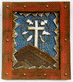 painted in yellow, turquoise and green, that he uses as an altar