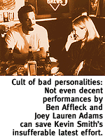 Chasing Amy is the story of Holden McNeil (Ben Affleck), a predictably Salinger-esque outsider who falls hard for Alyssa Jones (Joey Lauren Adams), a sweet but sharp-tongued comic book artist. She's also a lesbian, a fact Smith uses as a cute little obstacle to their love, which of course prevails. To give him a tiny bit of credit, Smith (who wrote the screenplay) does make an effort to justify Alyssa's switch as something more glorious than the straight male fantasy that all a lesbian needs to set her straight is, in the words of the film, "a hard dick." But no snappy dialogue can overcome the lack of respect with which Smith treats the character of Alyssa. Joey Lauren Adams is delightful as Jones; the character could easily become over-earnest or cloying, but Adams, with her little helium voice, manages to make Alyssa seem like a real person. She's strong willed and knows who she is, except for one little thing--her sexuality. Yeah, right.