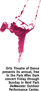 Show times are 8 p.m. Friday and Saturday through May 3, with 2 o'clock Sunday matinees April 27 and May 4, in the Tucson Center for the Performing Arts, 408 S. Sixth Ave. Tickets are $8, $7 for students and seniors, and available at the door, or by calling 579-3206 SIT TIGHT. "All is peaceful and still. Suddenly, you hear the strangest music and see these weird lights. Glancing at the stage you find a group of people swinging by their ankles on a trapeze. My God! It's OK, don't run away, you're only at an Orts concert." That's the setting, according to folks from the steadily innovative Orts Theatre of Dance. Indeed, tonight they'll combine eccentric music and dramatic lighting with the beautiful springtime eve, in their presentation of Orts In the Park After Dark. Topping the roster is "Trapeze God" Robert Davidson of Seattle, who'll be performing "Ave Maria" with Orts artistic director Anne Bunker. Also slated are "Totem" and "Windways," featuring music written especially for Orts by R. Carlos Nakai. Show times are 7:30 tonight, tomorrow and Sunday at the Reid Park DeMeester Outdoor Performance Center, Broadway and Country Club Road. Admission is free. For details, call 624-3799.