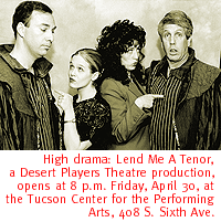 These three one-acts include Yeats' "Words Upon the Windowpane," directed by Phil O'hern, and starring Monica Kester and Michael Kirwin; "Spreading the News" by Lady Gregory, featuring Bruce Bieszki and Valerie Feingold, with direction by Heidi Brozek; and "The Late Arrival of Incoming Aircraft," directed by Amy Almquist, and starring JoDee Ann Kaser and Art Almquist. Show time is 3 p.m. in the Live Theatre Workshop, 5317 E. Speedway. Performances continue at 7:30 p.m. Friday and Saturday, 3 p.m. Sunday, through May 16. Tickets are $10, $9 for seniors and students, and available by calling 327-4242. GRASS AND BRASS. The Orchestra of Tucson revs up its spring season with a concert under the stars in Reid Park. Directed by Herschel Kreloff, the music roster will include selections from A Chorus Line and Ragtime; the "Thunder and Lightning" polka by Johann Strauss; and Haydn's "Trumpet Concerto, Second and Third Movements." The free concert is 7:30 p.m. in the Reid Park DeMeester Outdoor Performance Center, east of Country Club Road and north of 22nd Street. Bring a blanket or lawn chairs. Call 791-9246 for information.