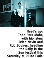 ![]() The Rocky Mountain State's Most Cerebral Road Band Is Comin' To Town. By Kate McAndrew FROM A MISSOURI roadstop notching some 10 years' efforts and a cache of miles and shows, Rob Squires, bass player for Big Head Todd and the Monsters (BHTM) calls in for a phone interview--one of six for the day. He and fellow band members Brian Nevin (drums) and Todd Park Mohr (lead guitar and vocals) are mid tour, roughly mid continent, and heading this way.
