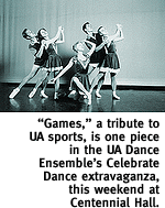 Curtain goes up for the UA Dance Division's Faculty Concert, Celebrate Dance, at 8 p.m. Friday and Saturday, May 2 and 3, at Centennial Hall. Tickets, available at the box office, are $10 general admission, $7 for students and seniors. For more information call 621-3341. For information on Ballet Arizona call 1-888-3BALLET. For UApresents tickets, call 621-3341. TW