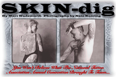 On the convention floor the air crackles with the insectine whir of electric needles. More than 25 booths representing tattoo shops from across the nation, France, New Zealand, Germany, Denmark and Scotland line the four walls and middle of the banquet room. It's like a strip mall for Body Art, and represented here are the designer labels of the emerging world of tattoo artistry. And none of them are doing flash today. All the artists represented here are members of National Tattoo Association, an elitist professional society that borrows the name "National" from the private company National Tattoo Supply. The Association is a separate entity with no direct commercial interest, but was nonetheless founded by National's owners, Flo and Don Makovsky. "We started the organization to help educate what we call John Q. Public about tattooing, that it's more than the old-time sailors with the skull and crossbones and the heart with 'Mom' on it," Says Flo. "We want to prove to the public that it really is a viable art form, and that it's come a long way. A tattooist can take a picture of your children and put it on you and you'll take your children with you forever." This, in fact, is precisely Flo's plan. She reminds me of my own grandmother, with her sparkling baby blues, salon-styled hair and tennis shorts and blouse. That is, until in that patient "yes, dear" voice she starts telling me about the 20-year-old tattoo she's having removed by laser from her shoulder blade in order to make room for the new project: She's going to have her four daughters tattooed on her back by the two leading tattoo portrait artists in the world, Jack Rudy and Brian Everett. "Anything that an artist can draw on paper a tattooist can draw on your body," she says proudly. "We're living canvases. We take our art with us instead of hanging it on the wall."
