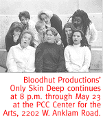 In conjunction with Zuckerman's project, Borders Books & Music will host Reducing Tucson's Homicide Rate, a panel discussion focusing on real solutions concerning Tucson's violent crime. Panel members will include Lt. Tom McNally of TPD; Sgt. Michael O'Connor of the Pima County Sheriff's Department; Sixto Molina, chief of the South Tucson Police Department; County Attorney Barbara LaWall; and UA criminologist Dr. Michael Polakowski. Event is free and begins at 7 p.m. in Borders, 4235 N. Oracle Road. For details, call 740-5729. EPIDERMAL DRAMA. They've spent the last year pondering the role of race in society, along with our often bizarre notions of beauty. The result is Only Skin Deep, Bloodhut Productions' latest provocative take on modern American culture. According to Bloodhut insiders, Only Skin Deep is a "fun, profound theatre piece that reveals stories of fear, loss, family, beauty rituals (and tortures), and the politics of hair." Performance is at 8 p.m. in the PCC Center for the Arts, 2202 W. Anklam Road. Production continues at 8 p.m. Wednesday through Sunday through May 23, with a 2 o'clock Sunday matinee on May 24. Tickets are $10, $8 for students, available at Antigone Books, Fit to Be Tried, the PCC Center for the Arts, and at the door. For information, call 795-0010.