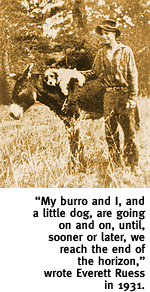 MANY OF THOSE Ruess met on his wilderness sojourns, which began in the summer of 1931, were so taken with his earnestness and idealism that they contacted his parents in L.A., offering to help. Reporters from Los Angeles, San Francisco and Utah covered the searches, and their dispatches inspired interest and leads from around the country. In the first months after his disappearance, and in the coming years, Ruess would be "seen" in a lot of places. In a transient camp in St. Petersburg, Florida. Hitchhiking on a Mexican highway. Working as a miner in Moab, Utah. In his 1942 book, Mormon Country, Pulitzer Prize-winning writer Wallace Stegner described a search by Neil Johnson, a California placer miner, and John Terrell, a reporter for the Salt Lake Tribune. Johnson had read of Ruess' disappearance, and early in 1935 went to his parents' home in Los Angeles and knocked on the door offering to help. But it was hard to get an Indian guide to sign on with the party. At a desert trading post, when Johnson and Terrell announced that the fellow they were hunting might be dead, the Indians scattered. They feared they might succeed. What if we find him? What if we find his spirit? What then? One expert tracker, a half-Ute, half-Navajo named Dougeye, agreed to lead the two white men as long as they left behind their camera. In Stegner's words, the guide wanted no part of "the winking-eye box." In August of 1935, Dougeye led Johnson and Terrell over miles of wild country. They swam the Colorado and continued north into Davis Canyon. Dougeye "spent two days circling like a baffled hound." His conclusion: "White boy went in, not come out." Friends continued to send to Ruess' parents copies of Everett's letters, and photos, hoping they might contain clues. One picture, taken in June 1931, shows Randolph "Pat" Jenks trying to coax Ruess' donkey, Pegasus, onto the back of a pickup truck. Jenks and Tad Nichols were driving from Cameron, Arizona, to Flagstaff on Highway 89, then unpaved, when they came upon Ruess on his burro. He was badly sunburned, half-starved, and dehydrated. They asked if he'd like a drink.