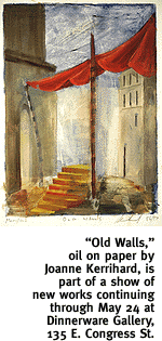 Joanne Kerrihard: New Work continues through Saturday, May 24, at Dinnerware Contemporary Art Gallery, 135 E. Congress St. Gallery hours are noon to 5 p.m. Tuesday through Saturday, noon to 7 p.m. Thursdays, and 7 to 10 p.m. on Downtown Saturday Night on May 17. Kerrihard will give a gallery talk at 7 p.m. Thursday, May 22. For more information, call 792-4503. At 6 p.m. Thursday, May 8, Dinnerware participates in a special roving concert put on by a cello and violin duo of the National Symphony Orchestra. The concert begins with a string quartet performing at Etherton Gallery at 5:30 p.m., and concludes with a brass sextet concert at the Hotel Congress at 6:30 p.m. See accompanying story for more information on the visit by the National Symphony Orchestra.