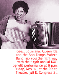 Born in French-speaking Lake Charles, Queen Ida was weaned on the Mardi Gras songs, waltzes and two-steps of the local Saturday night fai do dos. By day she helped her folks around the farm, but at night there was always someone handy with a fiddle or washboard. She describes the resulting zydeco sound as a blend of "French Canadian folk music with rhythm 'n' blues, Cajun, Latin, Caribbean, country and '50s rock 'n' roll thrown in." These days Ida is the reigning royal in the court of zydeco, and along with her Bon Temps band she'll ensure your feet keep moving until they close the doors behind you. Show time is 8 p.m. in the Rialto Theater, 318 E. Congress St. Advance tickets range from $20 to $25, $15 for KXCI members, available in advance at Hear's Music, Zips University, Piney Hollow, the Congress Street Store and KXCI-FM. Doors open at 7 p.m. for a Louisiana-style dinner (not included in ticket price), with free dance lessons starting at 7:30 p.m. Call 623-1000 for details. HEART FELT. Panoramic Productions plumbs the human condition with Terrence McNally's Love! Valour! Compassion! During its 1995 Broadway run, this celebration of the gay lifestyle landed McNally the Drama Desk, Outer Critics Circle, New York Critics Circle and Tony awards for best play. The New York Times called it "a high point of the season," while The New Yorker praised it as "beautifully written." Show time is 7 p.m. in the Tucson Center for the Performing Arts, 408 S. Sixth Ave. Performances continue at 7 p.m. Friday and Saturday, and 4 p.m. Sunday, through May 23. Tickets range from $8 to $10, available by calling 293-5397. CONTINENTAL SHUFFLE. Fancy footwork from the far-flung regions of Eastern Europe, Colombia, Hawaii, the Philippines and Mexico is the fare of the day at this weekend's Festival of Food, Music and Folklore. Presented by the Cultural Showcase of Tucson, the party will include more than 90 entertainers, including 10 local groups. This triad of temptations converges on the heart of downtown from 11:30 a.m. to 10 p.m. today, and 5 to 10 p.m. tomorrow, in the Tucson/Pima Main Library Plaza, 101 N. Stone Ave. Admission is free, with plenty of ethnic chow for sale. Call 888-8816 for details.