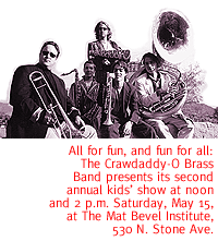 Show time is 8 p.m. in the PCC Center for the Arts, 2202 W. Anklam Road. Performances continue at 8 p.m. Thursday through Saturday, and 2 p.m. Sunday, through May 23. Tickets are $12, $10 for seniors and students, and $25 for a gala reception and performance on Sunday, May 15. Tickets are available at Antigone Books, Fit to be Tried and the CFA box office. Call 795-0010 for details. TRADITIONAL STEPS. After intermittent closures and evolving venues, the timeless Cushing Street Bar and Grill is back on the scene with a full roster of live music Thursday through Saturday evenings. Despite its many changes of ownership, this casual downtown rest stop remains one of the most charming old buildings in town; the hand-tooled wood cabinetry alone makes it worth a visit. Tonight, that historic ambiance is spiced by the exotic marimba sounds of local veterans Homero Cerón and Todd Hammes. The duo plays from 8 p.m. to midnight on the restaurant's ample private patio, 343 S. Meyer Ave. Admission is free. Call 622-7984 for details.