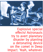 Unfortunately, director Mimi Leder thought it necessary to bring home the tedium of space travel by having the astronauts make long speeches about their families, their love of country, and their favorite books. And then one of them actually starts to read Moby Dick aloud. Much as I love Moby Dick, reading aloud is not exactly the stuff of exciting cinema. Back on earth, everyone is saying a tearful good-bye to everyone else, or repairing the damage of childhood trauma, or staring blankly into space. Much of this soul-searching is engendered by the President's decision to save only himself and one million other Americans by preserving the chosen in a giant cave for a couple of years. 200,000 scientists, doctors and cute TV anchorwomen have been pre-selected for survival, and the other 800,000 are picked by lottery. Elijah Wood, playing the 14-year-old who discovered the comet, is one of the pre-selected. His pals at school have told him that famous people get laid a lot, so he picks up on the cute blond chick he has a crush on with this unbeatable line: "Marry me...it's your only chance for survival!" He's such a geek that she decides to die with the rest of the peons. Astronomy nerds everywhere must have nodded knowingly at the realism of this response. In spite of the teeny-bopper love story and threat of world-wide extinction, there's not much emotional meat to this story. When Leone's character discovers that the world is going to end--the words "Extinction Level Event" appearing on her computer screen--director Leder thought that it was still necessary to blast ominous and melancholy music to ear-splitting levels, because how else would we know that impending planetary destruction is dramatic? In fact, it really is hard to care about the deaths of these characters, who, even though they are faced with the end of the world, still seem like whiners when they start yapping about their unfulfilled yearnings. And just why is Leder being handed these massive budgets by DreamWorks? Previously, she brought us Peacemaker, even when we asked her not to; and before that she had only worked for television. Under her direction, Deep Impact lurches from slow-moving tear-jerker to fast-paced action film with the rhythm of a drug-free, all-white reggae band. Perhaps most distressing is the appearance of Michael Tolkin's name as the writer of this film. This is the same Michael Tolkin who wrote two of the best films of the nineties, The Player and The Rapture. Apparently, under the influence of a $100 million budget, he's fully capable of producing the kind of "high-concept" drek that costs several times what a real anti-comet missile system would cost. Also slumming here, in bit-but-not-chewed parts, are Vanessa Redgrave, Maximilian Schell, James Cromwell and Swingers star Jon Favreau, who must have been relieved when his character was jettisoned into space early in the film, saving him from a full hour of hand-wringing. While all this talent is wasted, the big special effects are pretty fabulous. There was clearly a lot more creativity amongst the effects team than in the scriptwriting and directing departments, and some of the shots are not only convincing, they're clever and inventive. An overhead view of New York City that shows people on rooftops running away from the incoming tidal waves, and some beautiful faux-underwater footage of flooded city streets were particularly nice.