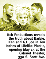 MOLDED LOVE. Seems G.I. Joe is back, and this time he has far more interest in Ken than all-terrain Tonka Toys. That means heartbroken Barbie will likely relapse into anorexia--a condition exacerbated when her pal Strawberry Shortcake falls for female shot-putter Cabbage Patch. Apparently, all prefabricated preconceptions are up for grabs in Tom Slauson's Ten Inches of Lifelike Plastic, presented by Itch Productions. Show times are 8 p.m. today through Sunday, and May 21 through 24, with a 2 o'clock matinee on Sunday, May 17, in the Temple of Music and Art Cabaret Theatre, 330 S. Scott Ave. Tickets are $10, $8 for students and seniors, and available by calling 748-0291.