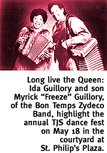 ACCORDION ROYALTY. Born in Lake Charles, Louisiana, to hard-scrabble rice farmers, Ida Guillory was spoon fed on French lullabies, Mardi Gras songs and waltzes of the bayou. As Queen Ida, she first hit the Tucson stage with her Bon Temps Zydeco Band in 1984, and a legend was born. Now Ida and her court fire up St. Philip's Plaza, with three nearby restaurants offering full dinners prepared from her cookbook, Cookin' With the Queen. Opening will be Tucson's Crawdaddy-O brass band, followed by Dr. Mojo and the Zydeco Cannibals. Show time is 7 p.m. in St. Philip's Plaza, 4300 N. Campbell Ave. Advance tickets are $22, $17 for KXCI and TJS members, available at Hear's Music, Piney Hollow, Mars-Hall Music Center, KXCI, or by calling 623-1000. Tickets are $3 more at the door.