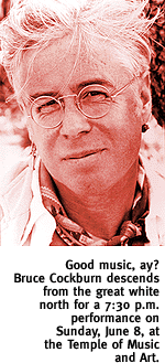 DEEP CANADIAN CHORDS. Sometimes the best map will not guide you, you can't see what's around the bend/Sometimes the road leads through dark places/Sometimes the darkness is your friend. Indeed, shadows seem to be the stock and trade of powerful, often profound recording artist Bruce Cockburn, as exemplified in the preceding lines from his "Pacing the Cage." Praised by critics for his "poetic, innovative, often provocative songwriting," Cockburn's lyrical introspection has landed him 13 gold and three platinum records in his Canadian homeland, as well as 10 Juno Awards (the Canadian Grammy). He's also known for regularly charting out new styles and creative paths, a penchant continued in his latest release, The Charity of the Night. Cockburn says the recording tugs heavily on his own history. But one thing that hasn't changed with time is the sheer integrity of Cockburn's creative process. "I've been at this long enough that I can feel when a song's coming on," he says. "When you're able to touch on visceral things that are common to everyone's life, that's a lucky thing. A given experience, like love or death, may be common to all of us, but we each have our own points of contact; to share my points of contact is part of the fun for me." Cockburn performs at 7:30 p.m. in the Temple of Music and Art, 330 S. Scott Ave. Tickets range from $20 to $24, and are available at Hear's Music, Zip's East, Zip's University, Zip's West, or by calling 881-3947.