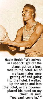 One day after practice our coach, Fred Enke, called me over. He said, "Hadie..." Oh God! I thought I'd done something wrong. One thing he didn't want us to do was dunk the ball. He'd always tell us to use the backboard. I thought maybe he'd seen us doing some clowning. I walked over to him, and he had his head down. He placed his hand on my shoulder. Something was on his mind. I could read that automatically. He said, "Hadie, we're off to a good start, and I don't know how to put this to you. Please believe me that I tried everything I could. We're going to Lubbock, Texas, and I've tried everything to find a hotel that will accommodate the whole team." He said, "The answer is all the same. 'No.' But I want you to go, the team wants you to go, and basketball wants you to go. It would be good for the state, too. I want you to think about it." I commenced to walk away, not realizing that my entry onto the basketball team was making history. I wasn't thinking about that. That was the furthest thing from my mind. As I began to walk away, I thought, "My God, I can't let someone else do this. I'm here. I have to take on this challenge. I just have to do it." I walked back over to the coach and said, "Let's go. I'm ready." It seemed as though there was a lot of weight lifted off his shoulders. I called my dad, and I told my him the decision I'd made. He applauded me for it. He told me, "I know it's going to be a very difficult task for you--you've never been confronted with anything like this. As a kid, you were sheltered and protected by your parents." And I said, "Do you think we should tell Mom about it?" He said, "Son, it's up to you. But if I were you, I wouldn't mention this to your mother." I said, "Why, Dad?" He said, "If you did, Arizona would be minus one basketball player, and that would be you." I didn't tell my mother until after this was all over. 1954, Texas Tech. We arrived in Lubbock, got off the plane, got on a bus, rode to the hotel. All of my teammates were getting off and going into the hotel. I walked up the steps and into the hotel, and a doorman placed his hand on my chest. He said, "You can't come in." I had to wait outside. I went and sat on a bench along with my coach and some of the other players who were ready to strike. They didn't want to play. They said, "We don't have to take this." I said, "We came down here to play the basketball game and try to win and do our very best and get out." You see, I couldn't react. Everything would have been destroyed, and that wasn't what I wanted to do. And I'm sure that wasn't what the other fellows wanted to do, although there was very serious talk about not playing the game. But you went on these trips, and you got picked out by a black family. Beautiful people. They wanted to do everything they could to make you comfortable. Anything you wanted to eat you could have. On later trips, once the car started to leave the hotel, I would always automatically look back and wonder how the other guys were doing. And it almost brought tears to your eyes. I tell you. It was the loneliest feeling in my life. But upon arriving in Lubbock, I stayed with a doctor, Dr. Miner. Very nice person. He has a hospital there. A small hospital. That's where I stayed. I can recall that he made me as comfortable as anyone could. We visited some black elementary and high schools there, and I chatted with the students But at nighttime, your mind is so entangled that you can't think right. It just blows your mind, and you try to lie down, and you can't lie down. You try to watch TV. It doesn't work. Radio doesn't work. You're saying to yourself, "What have I done? Out of all the teaching that my mother and father gave me, my teachers, my coaches, the whole lot. The olive branch. None of that's working. None of that's working." It just petrifies you to know that you have to be split off from your team and treated as though you were someone from another world. It's not easy. It's not easy. I tell you, that hand on my chest, I still feel its imprint. Ernie McCray, Class of 1960, MED Elementary Education 1962 I was recruited to play basketball by a couple of schools, although the University of Arizona didn't go after me. But Allen Stanton met me at the YMCA after my senior year, and we did some one on one. He was a graduate student then and the freshman basketball coach. They didn't recruit black players much. I was the only one on my team. There were two other black players my sophomore year, and they quit at about mid-semester. Eddie Mitchell and Elmer Green.