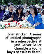 Her architecture pieces fare better. The mysterious shadows in the corners of the stone churches and alleys make for fine atmospheric renderings of dark and light. "Vers la Lumiere" is one of the best. It shows a dark stone staircase leading to the bright redeeming light of the open air. Ambiguity is mostly in short supply in the contrary realm of photojournalism. The most powerful work in Galvez's Rivera suite ironically is also the most obvious. Chosen by his editors at the L.A. Times to illustrate the written account of the boy's death, it's a classic depiction of maternal grief. The wailing mother leans over her son's coffin for a final good-bye. Her surviving son, at left, clutches her arm, while an elderly family friend at right fondly adds a flower to the bier. It's a good, solid newspaper photograph that almost accidentally makes that transcendent leap from cliché into archetype. The rest of the suite is more workaday. Galvez made repeated shots of the somber mourners sitting in pews, leaning on railings, gathering on the church steps, in close-up and at a distance. His point no doubt is to show the wide path of grief cut by almost any death, especially of one so young, yet none of these other pictures has quite the power of the mother's.