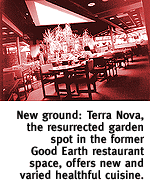 ![]() Terra Nova Takes Over Where Good Earth Ends. By Rebecca Cook WHEN THE GOOD Earth closed last December, its loyal fans shed more than a few tears. During its 18 years, they had come to think of the eastside restaurant as a cozy home away from home. Particularly disconcerting was the cause for the abrupt cessation in service, reportedly a battle over the right to use the restaurant's trademark name. Without question, the name belonged to the owners of the Good Earth Corp. of Santa Cruz, Calif., and they had absolutely no qualms about divesting local franchise licensee Norm Land.