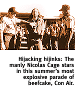 ![]() Sweaty Beefcake 40,000 Feet In The Air! By James DiGiovanna IN THIS AGE of AIDS, Hollywood gay cinema has been disappointingly chaste. Longtime Companion, which perhaps initiated the contemporary gay film, features only one scene of men in bed together, and in that scene the lovers turn away from each other and go to sleep without even kissing, emphasizing the chilling effect the plague has had on intimacy, but depriving the audience of voyeuristic pleasure. In Philadelphia, Tom Hanks never kisses his lover, and their bodies are hidden beneath gray suits, completely obscuring any glimpse of man-flesh. Even films far from the Hollywood mainstream like My Beautiful Launderette failed to deliver the kind of vivid display of manly bodies that audiences so crave, instead aping Hollywood in emphasizing commitment over heat. Well, all that has changed with Con Air, the hottest piece of man-action this side of a Jeff Stryker flick. Bulging, glistening pectorals are the stars of this pulsating visual tribute to testosterone, providing a growling festival of sinew, sweat and sexuality.