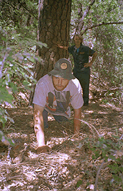 Cutline: Cub scouts: Tracker Susan Morse points out claw marks on a "babysitter tree" while a volunteer marks the tell-tale trail. Photo by Kevin Franklin.