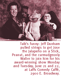 Peanut is a fuzzy, purple terror. Walter is an elderly curmudgeon who speaks his mind about anyone and anything. And José Jalapeño is just a self-effacing little pepper. These colorful characters, brought to life by Dunham's impeccable ventriloquism, have twice won him Ventriloquist of the Year awards, and the 1997 Funniest Male Stand-Up Comic Award. "What makes this performer the best at what he does is the believability factor," says one critic. "His characters have more personality than some people I know." Dunham performs at 8 and 10 tonight and tomorrow in Laffs Comedy Caffé, 2900 E. Broadway. Tickets are $17 for the 8 p.m. shows, $14.50 for the 10:30 p.m. shows, and available by calling 323-8669. HEALTHY OUTING. Learn a bevy of nutritional tidbits and volumes of organic produce information at the Tucson Cooperative Warehouse-sponsored natural health workshop. Along with sampling a potpourri of natural products, you'll get the scoop on the cooperative movement, sessions about the "wonder sweetener" Stevia, and the facts on essential fatty acids and flax seed oil. A long-time player on the local scene, TCW is a member-owned business providing thousands of natural food products at wholesale prices. Workshop is free and runs from 6 to 9 p.m. in the Unitarian Universalist Church, 4831 E. 22nd St. For reservations, call (800) 350-2667.