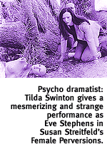![]() Weird And Relentlessly Abtruse, 'Female Perversions' Flounders. By Stacey Richter ONE OF THE notes I wrote to myself while watching Female Perversions says, simply: "She has sex with a chess piece." That, for me, sums up the movie in a nutshell. Female Perversions is a weird, dreamy, provocative and not entirely coherent dramatization of an academic text that flounders in the gray zone between interesting and self-indulgent. Director Susan Streitfeld got the inspiration for her screenplay from a study called Female Perversions: The Temptations of Emma Bovary, by psychoanalyst Louise J. Kaplan, which she's used as a jumping-off point for a story about a klatch of women saddled with some deeply troubled notions about sex, gender and the acquisition of power. The resulting film has the earnest flavor of a really good student film by a person who almost gets it, but then doesn't really quite.