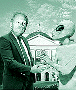 ![]() Skeptics Take Aim At The UFOs In Arizona Skies. By Jim Nintzel SOMETIMES YOU HAVE to wonder if we're not living in the End Times after all. Take, for example, Gov. J. Fife Symington III's surreal press conference last week, where he announced--with the same straight face he'd no doubt used with his many lenders--that state troopers had captured the space alien responsible for those mysterious lights that drifted across Arizona skies on March 13. When the ET was brought out on stage, it turned out to be Symington aide Jay Heiler in a Halloween costume.