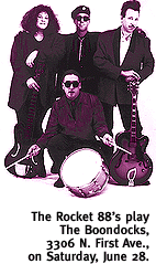We're talking none other than Funky Bonz, the regular Monday night band at the Chicago Bar. And at least one thing's for sure: Chicago bartender Alison Preslar digs 'em big-time: "They are so good," she says breathlessly between pouring brews. "Definitely, they got the funk, and it's great dance music with a sax, drummer and bass. Then they do this awesome calypso reggae stuff. I think everybody should come check these guys out." Funky Bonz hits the stage at 9:30 p.m. in the Chicago Bar, 5954 E. Speedway. Best of all, there's no cover. Call 748-8169 for information. DESERT WINDS. It's been said that classical music soothes the torched soul. if that's true, then the Sirocco Wind Quintet offers downright sanctuary with an evening performance at Border's Books and Music, 4235 N. Oracle Road. On the musical roster are Reicha's Bläserquintett in E flat, Ibert's Trois Pieces Breves, and McBride's Fanfare for Young People. That's in addition to several modern and Dixieland pieces. Free performance is from 7 to 8:30 p.m. Call 292-1331 for information.