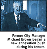 BECAUSE OF THE changes in state law, among other factors, by the end of the 1980s the pace of Tucson's growth had slowed considerably. Despite that, the decade had seen three large annexations, making 1990 Tucson a city of 156 square miles. By then city annexation officials were focusing on fewer areas, most of which were partially developed residential subdivisions. They attempted nine annexations between 1990 and 1993, succeeded at eight of them, and brought 6,300 people and six square miles into the city. Then Michael Brown was appointed city manager. In the fall of 1993 he realized the City Council thought re-energizing the annexation movement was important. Brown created Project Foresight to focus on the issue. Annexation officials were ordered to examine three financially rich areas. Each potential target could generate big revenue returns in sales and other taxes while not requiring vast city expenditures to provide services. Like the annexation of Tucson Mall a decade earlier, these three areas could provide a substantial profit for the city. One target area, the northwest commercial corridor along Interstate 10 south of the Cañada del Oro Wash, was also coveted by Marana. While this area is obviously contiguous with City of Tucson infrastructure--not Marana's--in this battle the little town proved it could beat its big neighbor in the annexation game. Another lucrative annexation was La Paloma Resort. The city had to somehow snake up the foothills, taking in an adamantly opposed majority of residents to get to the resort. Brown said this area "would've been better to do back in the '70s...It was clear these folks wanted the large lots more isolated in the foothills...we needed to accommodate them." But opposition proved overwhelming, and city officials, at least temporarily, abandoned their efforts. Finally, there was the commercial/ industrial Palo Verde Corridor on the south side of town. The city pushed through the state Legislature a temporary law which made annexing the area much easier. The change meant that one agreeable large property owner alone--in this instance Tucson Electric Power Company--could ensure the annexation's success. That infuriated hundreds of nearby small-business and property owners who would be affected. Many of the business owners abhorred the thought of city fire and building inspectors breathing down their throats, not to mention the regulatory fees annexation would mean. They've tried numerous legal maneuvers to stop the annexation. The issue is still unresolved, and an August court date has been set to settle the fight. Palo Verde was another in a string of annexation cases where the city was accused of bullying people. But Joel Valdez argues that even if "the Apostles were sitting on the (city) council, there would still be big opposition to annexation." WITH PROGRESS ON its three potential cash cows stymied, Project Foresight began grabbing almost any potential annexation. In the last three years, it has succeeded in 21 cases, but failed in 12 others. More than 30 square miles have been annexed into the city, bringing the total to 193. These new areas include nearly 6,000 people--although 3,800 are inmates at two prisons on south Wilmot Road. Valdez succinctly summarizes this current doctrine: "Annexing dirt is good. You can better manage the growth in relation to the current city." The rebirth of the "annex everything" philosophy under Tucson's current city council majority is apparent from the results: Two-thirds of the annexations under Project Foresight have been vacant land, and only two annexations included economically attractive commercial property. Current trends actually have a long history. For years, annexation has been the primary means by which city officials planned for growth. But they were plans based on quantity, not quality. And while politicians concentrated on the new, the developing, the growing, they often put off maintaining the older parts of town. Not surprisingly, older parts of Tucson now have hugely expensive infrastructure needs which must be addressed. And the faithful still see annexation as one way to pay that bill--and no proof it will work is required.