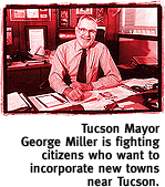 Hummel's theology held that annexation was a choice between Tucson as a vital, growing community, or some stagnant backwater. Among the advantages to expansion he cited, according to a 1956 article in The Arizona Daily Star, were that "...TV shows are given cities on a population basis, advertising rates are affected, and city population is considered when attempts are made to encourage industry to come in." The city's aggressive attitude toward annexation created many enemies. The opponents resented being told what was going to happen to them; they objected to higher property tax rates; they wanted to maintain their "rural" lifestyles. But they had little choice in the matter, since annexations were relatively easy to accomplish. Despite that, opposition was fierce enough that Hummel, in jest, once literally donned crusader's armor to attend an annexation meeting. Since those days, many Pima County residents have been hauled into the city limits against their will. But their cries of objection did not stop the evangelists of annexation from spreading the faith. City growth proponents denounced their opponents as mean-spirited, power-hungry, and just plain stupid. More than two dozen annexations during the 1960s added less than 10 square miles to the city. In the next decade, however, with Lew Murphy as mayor and Joel Valdez as city manager, Tucson grew by almost 20 square miles in 40 separate annexations. But competition was on the horizon: The 1970s also saw the incorporation of both Marana and Oro Valley. In 1974, after years of effort by Tucson and Pima County officials to block the move, Oro Valley residents formed a city, saying they wanted to control their own destiny. Marana residents incorporated three years later, in part to protect their agricultural heritage from being literally swallowed up by Tucson Water as it bought and retired from production large tracts of farm land. MURPHY SAID RECENTLY, "The city is the loser when it can't tax the unincorporated area, and the tax base is restricted...The City of Tucson resident is without a doubt subsidizing the lifestyle of the unincorporated residents." Valdez agrees. "Without annexation," he maintains, "the pot doesn't get any bigger...it's an equity issue...Why do poor people who live along the Santa Cruz have to pay property taxes so that county residents on the eastside can use a fancy city park and facility?" True believers think those non-city residents who call themselves "Tucsonans" are barbarians in this religious struggle. Many who live in the unincorporated metro-area come here to escape the hassles of urban life. But at 5 p.m., when they're ready to leave their jobs in the city, they demand every light on Grant Road be synchronized to speed them back to their Ranchita Desierta just over the city line. Tom Volgy, who served as both a Tucson city councilman and as mayor during the 1980s, recalls, "Annexation was a big issue for me because people outside the city work, play, use all the facilities, but don't provide the resources city residents do...If we're to build a real community, these problems don't stop at the border of the city...This is an issue about mutual obligation, about where we want to go and why. But, he adds, "I frankly don't like annexation. It's a distant second choice to metropolitan government...Annexation is not a good tool. It is piecemeal and blunt." But the idea of one consolidated government for metropolitan Tucson quickly faded when Volgy left office. Even attempts at consolidation of services were a failure. Citizen committees endorsed the idea repeatedly, but city and county governments have been unable and unwilling to do it.