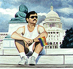 ![]() But on June 18, just a day before the reception, the artist received a call from the gallery to inform him the colorful photorealistic work displaying a gay man holding a rainbow flag, and proudly sitting in front of our nation's capitol building, had been defaced: An unknown person had scrawled "FUCK YOU" across the canvas. Pietronigro requested the painting remain on exhibit, defaced, in order to educate the public that homophobia is alive and well, even in one of the most openly gay cities in America. The Lurie Company denied his request. Security staff removed the painting and, seeming to miss the irony, placed it in the closet for the duration of the exhibit. (But all is not lost: The defaced work will open in a new show starting July 1 at another Bay Area gallery; and web browsers can see the original image online at http://www.webcastro.com, in the Web Castro Gallery section.)