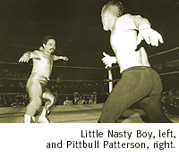 Generally, the midgets (this seems to be the preferred term amongst the wrestlers, with the politically correct "little people" getting no play, and only a few references to the medically correct "dwarves") do a lot of flying about the ring, but their best moments come when they bite the asses of big people. Whether it's the referee or a full-size wrestler who has stumbled into the ring, when you see a tall fellow, you can be pretty sure his ass is gonna get bit.