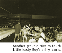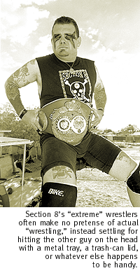 Section 8 seems truly dedicated to the sport, and he's extremely accessible. While some of the wrestlers sell autographed photos of themselves, Section 8 gives them away. He runs a school for young pro-wrestler wannabes which gives kids some organized violence to keep them away from the distressingly disorganized violence of the streets, and he demands that the kids maintain good grades and good behavior at home. And, while Section 8's crew does most of the potty-mouth talking, he has vowed to start cleaning things up to accommodate the new, younger audience they've begun to attract. "From now on, the worst word you're gonna hear," he tells us, "is 'ass.' " That makes sense: you can't say "ass-biting midget" without the word "ass."