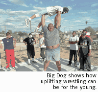 Section 8's "extreme" wrestlers often make no pretense of actual "wrestling," instead settling for hitting the other guy on the head with a metal tray, a trash-can lid, or whatever else happens to be handy. In some matches, tables full of "weapons" are brought into the ring. The "weapons" are, of course, essentially harmless, but there's good campy fun in watching somebody get hit with a plastic baby bathtub. (Oh yeah, that's gotta hurt!)