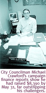 Octavio Bartello, a former aide to Congressman Ed Pastor who has worked on local political campaigns, also had no contributions, but had lent the campaign $73.34, which he had spent on office supplies, walking lists and photocopies. The winner of the Democratic primary will face Republican Fred Ronstadt, the son of city Parks and Rec Director Jim Ronstadt. Having only recently assembled his campaign, Ronstadt reported no fundraising activity before May 31. Over in Ward 3, Councilman Mike Crawford had collected $8,390, including $100 he lent the campaign. Crawford had spent $3,189, leaving him with $5,201 in the bank. A lawyer in the Pima County Public Defender's Office, Crawford has found many of his contributions in the legal and real-estate communities. Appointed to the Ward 3 seat in 1995, Crawford has drawn two challengers. Jerry Anderson, who worked as an aide to former Mayor Tom Volgy and later in the city's annexation division, had collected $420 in contributions through May 31. He'd also loaned the campaign $1,201. Alex Kimmelman, an historian who has worked in the city's planning department, had received zero contributions and had lent the campaign $240, all of which had been spent on campaign basics. The winner of the Democratic primary will face Republican Dan Coleman, a lobbyist at the state Capitol, in the November general election. Coleman, who filed his campaign papers late last week, did not report any fundraising activity through May 31. Coleman is the only candidate who declined to sign a campaign contract with the City Clerk's Office. Since he didn't sign a contract, Coleman will not required to keep campaign spending under $68,300. Nor will he be eligible for matching funds.