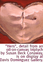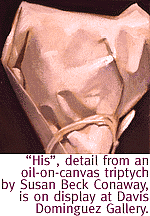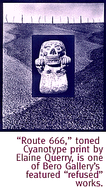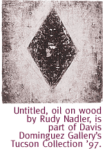![]() Who Got Into What At Various Invitational Art Exhibitions. By Margaret Regan EVERY YEAR ABOUT this time, group shows spring up around town with the same reliability that parched Tucsonans scan the blue, blue skies for rain. Maybe it's because it's too darn hot to devote much time to dreaming up a theme and curating a show around it, or maybe it's because group shows make for a reasonable end-of-season windup. Right now, Davis-Dominguez Gallery has on view its annual summer invitational of small works by Tucson artists, a collection of some 40 paintings and sculptures whose dimensions were supposed to measure one foot by one foot. (Alfred Quiróz wittily complied with the rule by constructing one foot of the human variety, a cartoon-bright painted wood foot sculpture in his continuing Aztec television series.) And though this year's show, Tucson Collection '97, as always gives a good sampling of the types of art being done around town, particularly in painting, this time around it can also be read for different meanings. That's because the Arizona Biennial '97 at the Tucson Museum of Art (reviewed in the June 26 issue of The Weekly) as usual has occasioned controversy and plain old hurt feelings among local artists whose works didn't get in. Bero and Raw, two small galleries downtown, decided to showcase some of these refused pieces, not to criticize the Biennial, according to Bero's Beth Wachtel, but to celebrate the talent of the rejected artists. (Naturally, participation in the Bero/Raw show was entirely voluntary.) Thus, the joint show, featuring some 30 works by 24 artists, is called, Salon de Célébration.